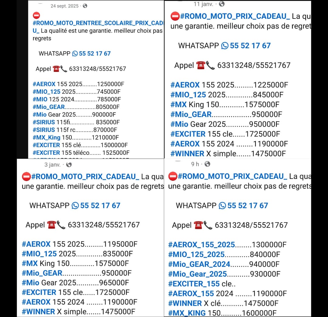 Quatre images, quatre dates, quatre prix différents sur presque tous les articles en moins de quatre moisLe portrait de ce jeune garçon n'est pas très loin des caprices que nous font essuyer les vendeurs de motos. Avec eux, il faut être au taquet. Si vous avez un peu d'argent et que l'Etat a frappé fort pour que les prix soient réduits, vous avez intérêt à courir vite vous procurer un engin. Si vous pensez pouvoir jouer au lièvre avec eux, en attendant que le temps se vide de sa substance pour que les prix baissent encore, ils auront le plaisir de vous montrer que si l'hyène n'a jamais appris de ses erreurs, c'est son problème.