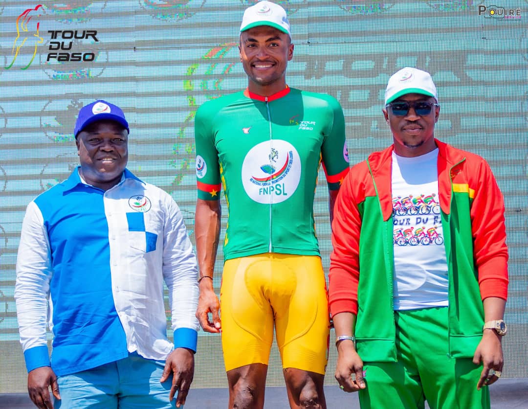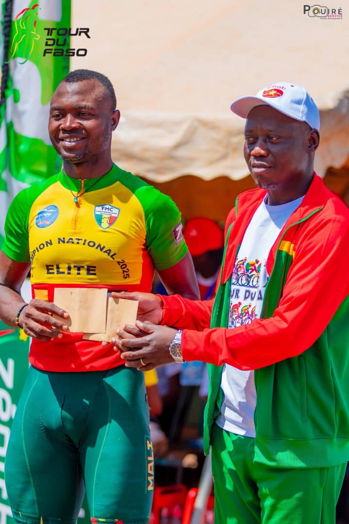 À gauche, Tiémoko Diamouténé vainqueur de la 4e étape et à droite, le ministre des sports, Roland SomdaPaul Daumont garde également le maillot vert du classement général aux points mais cède le maillot des points chauds au Belge Timmy De Boes. Il est naturellement le premier des Burkinabè au classement général.