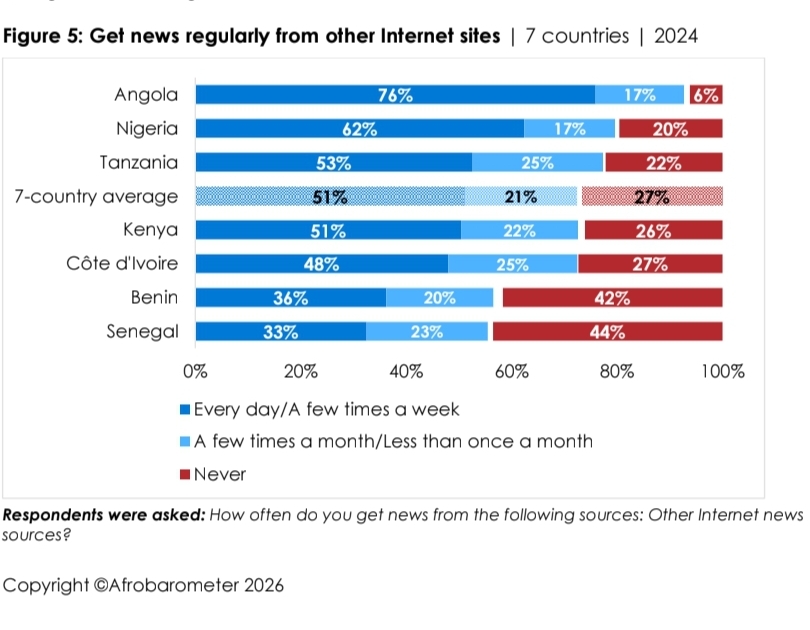 Les téléphones portables sont le principal moyen d'accès à Internet (85%). Les jeunes adultes (18-35 ans) sont plus susceptibles d'être des utilisateurs réguliers d'Internet (87%) que les cohortes plus âgées (74%-83%).Plus de huit répondants sur 10 (82%) déclarent s'informer « quelques fois par semaine » ou « tous les jours » via les réseaux sociaux (Figure 2).