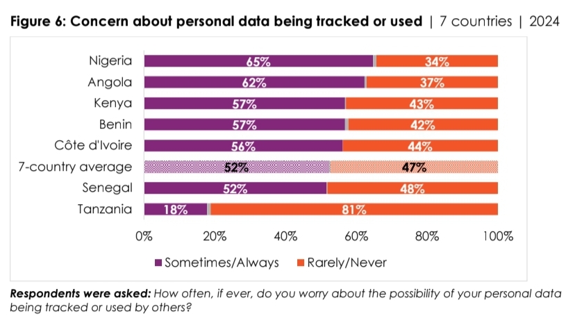 En moyenne à travers l'Angola, le Bénin, la Côte d'Ivoire, le Kenya, le Nigéria, le Sénégal et la Tanzanie, la majorité des répondants se disent préoccupées par la sécurité de leurs données personnelles en ligne et estiment que leur téléphone portable est l'appareil le plus vulnérable aux menaces numériques.