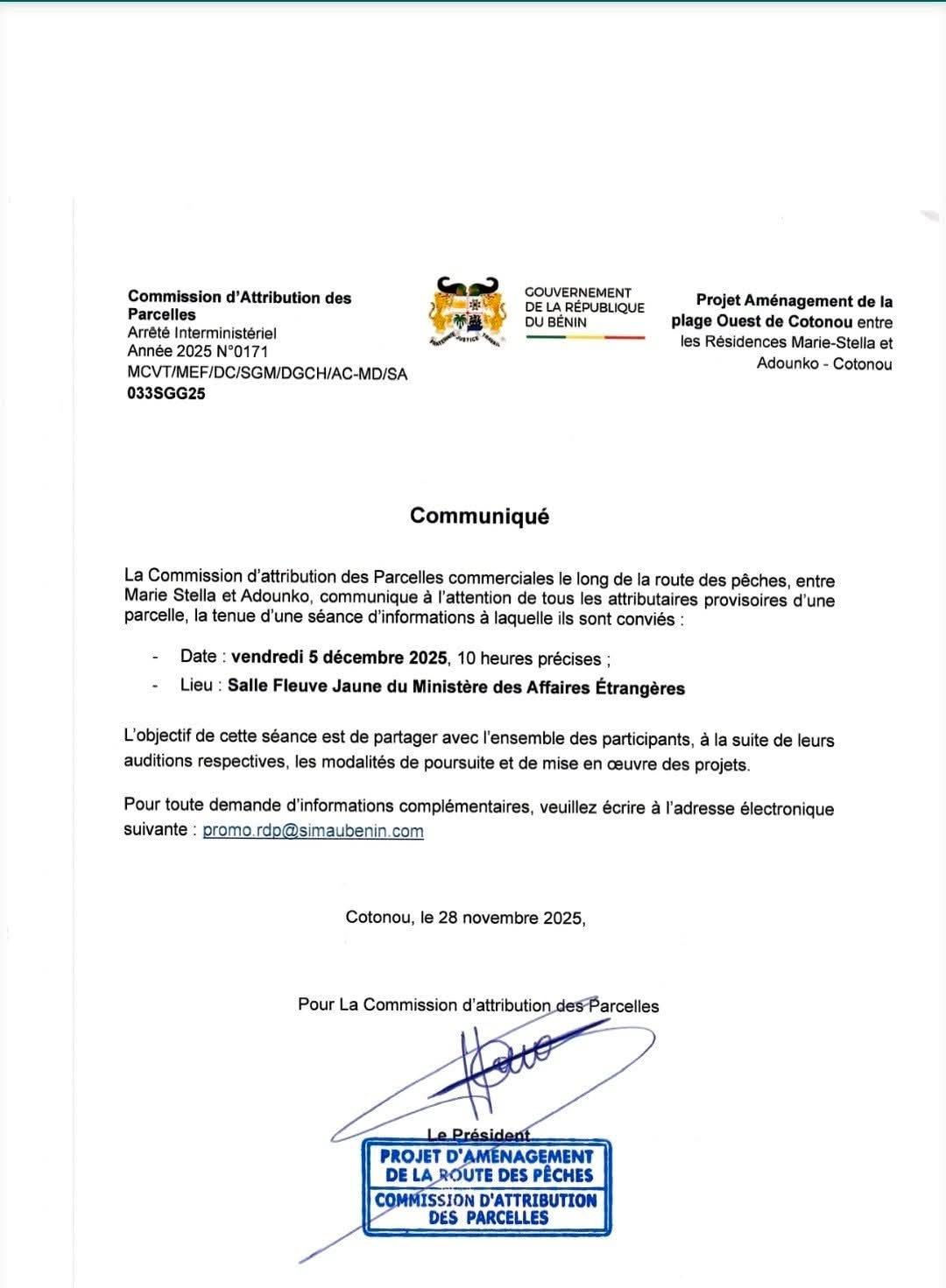 Une séance d'information est prévue vendredi 5 décembre 2025, à 10 heures, à la Salle Fleuve Jaune du ministère des Affaires étrangères, à Cotonou. Cette rencontre s'inscrit dans le cadre du Projet d'aménagement de la plage Ouest de Cotonou. Elle intervient après les auditions individuelles menées ces dernières semaines.