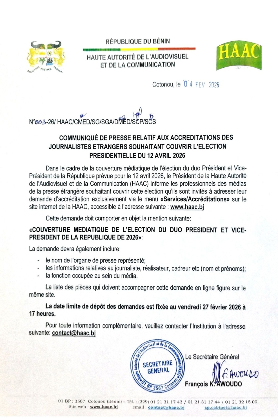 La Haute Autorité de l'Audiovisuel et de la Communication (HAAC) du Bénin a annoncé l'ouverture de l'accréditation pour les médias internationaux souhaitant couvrir l'élection présidentielle, prévue le 12 avril 2026.