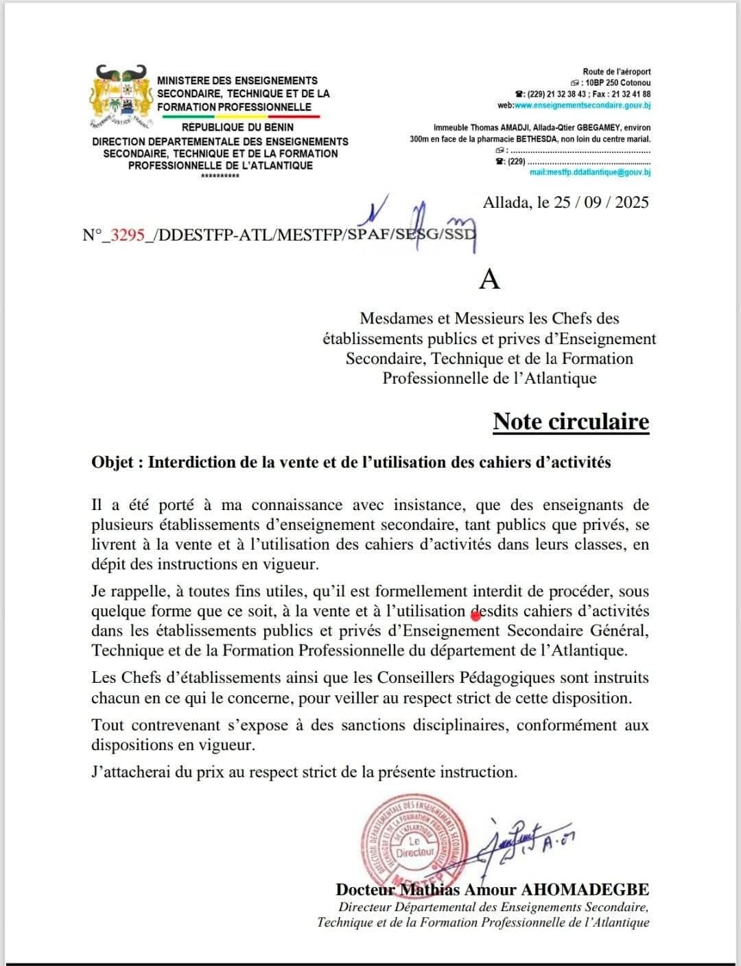 Par une note circulaire en date du 25 septembre 2025, la Direction Départementale des Enseignements Secondaire, Technique et de la Formation Professionnelle de l'Atlantique interdit formellement la vente et l'utilisation des cahiers d'activités dans les établissements publics et privés du secondaire général, technique et de la formation professionnelle.