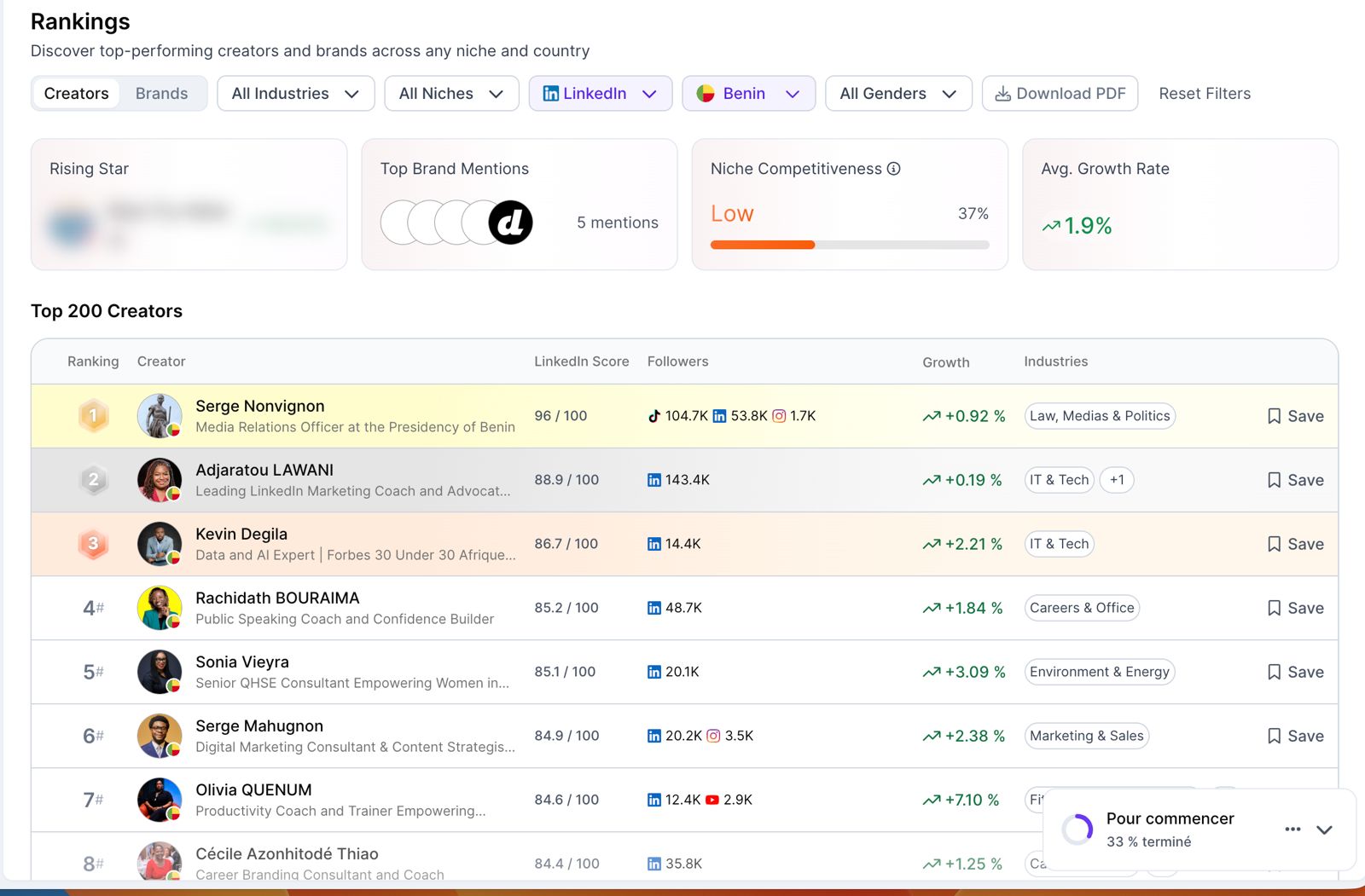 Le responsable Media Relations Officer de la Présidence de la République, Serge NONVIGNON, est le Numéro 1 du Top 200 des créateurs les plus influents au Bénin en 2025. Le dernier classement de la plateforme de scoring d'influence Favikon l'a hissé au sommet des créateurs les plus influents du pays.