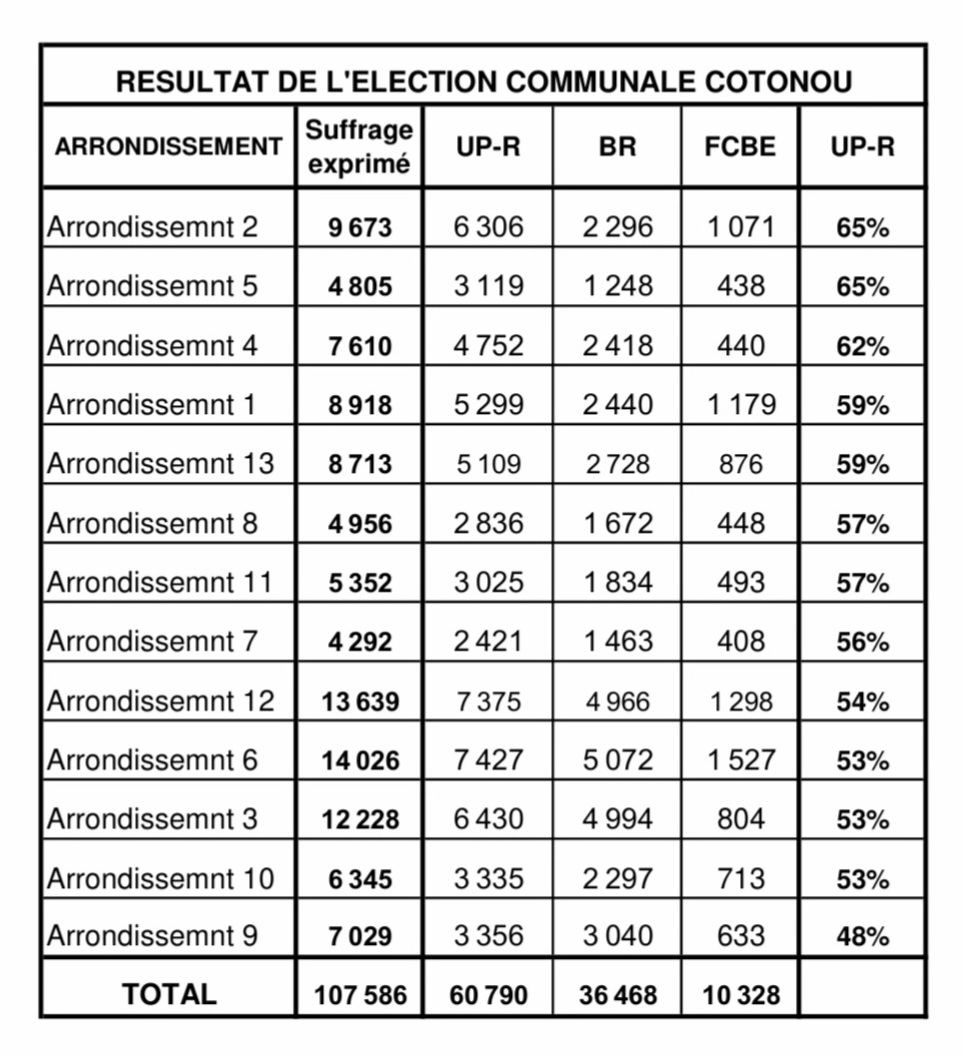 L'Union Progressiste le Renouveau est arrivé en tête, avec des résultats très édifiants dans les 13 arrondissements que compte la commune de Cotonou.