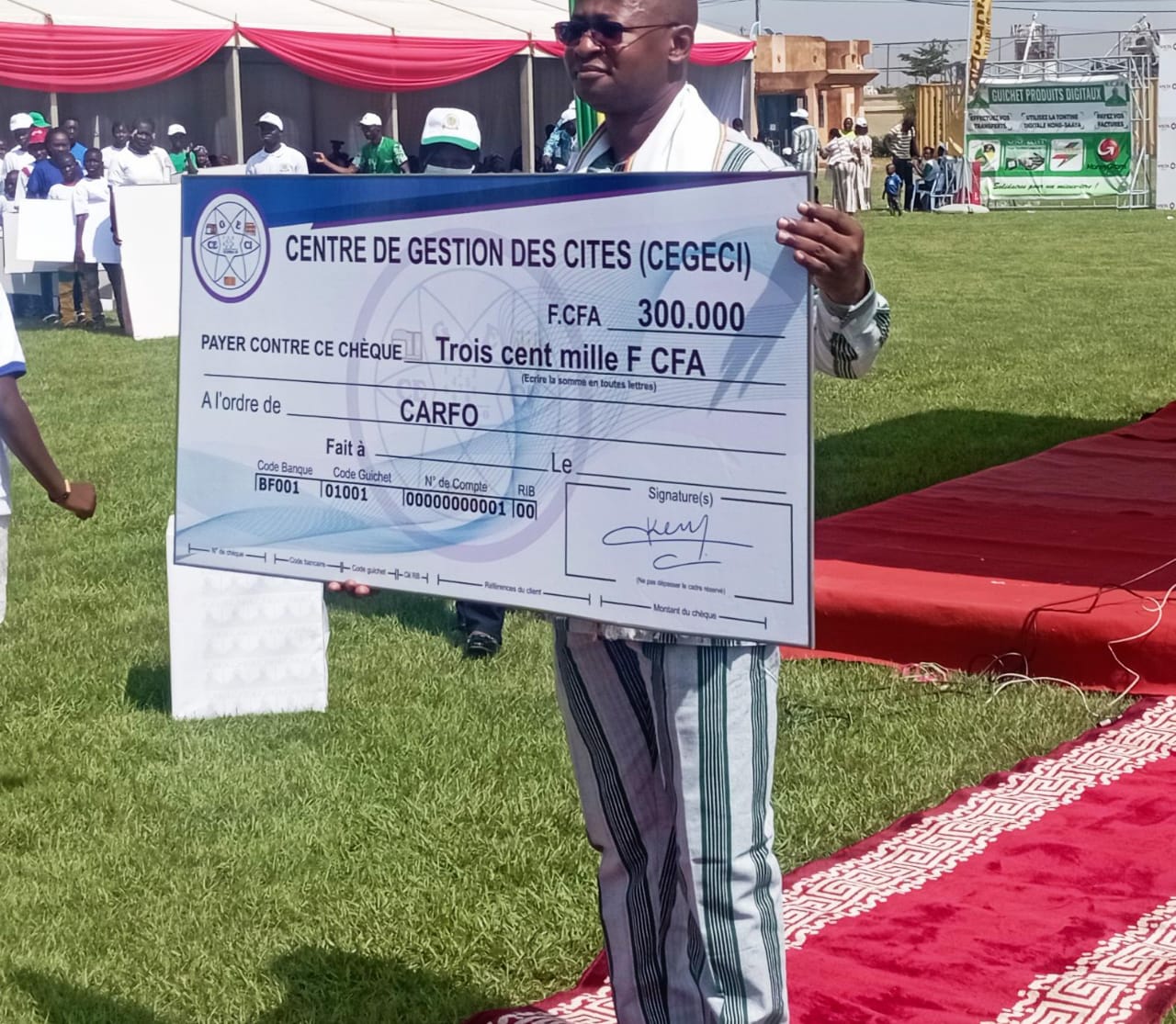 Le directeur général de la CARFO avec le chèque d'un partenaireLa Caisse autonome de retraite des fonctionnaires a octroyé des prix d'excellence d'une valeur de 200 000 francs CFA chacun au profit des dix meilleurs bacheliers en appui à la scolarité de leurs études supérieures.