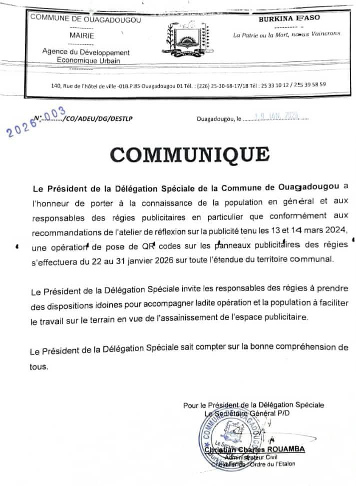 Le Président de la délégation spéciale (PDS) de la commune de Ouagadougou informe la population et les acteurs du secteur publicitaire, du lancement d'une opération de pose de QR codes sur les panneaux publicitaires des régies.