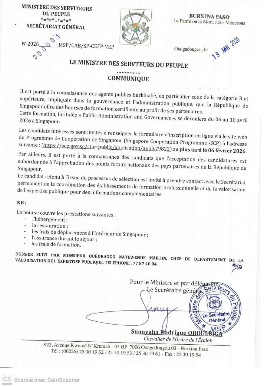 La République de Singapour met à la disposition des agents publics burkinabè, des bourses de formation certifiantes dans le domaine de l'administration publique et de la gouvernance. Cette opportunité s'inscrit dans le cadre du Programme de Coopération de Singapour (Singapore Cooperation Programme – SCP), au profit des pays partenaires.