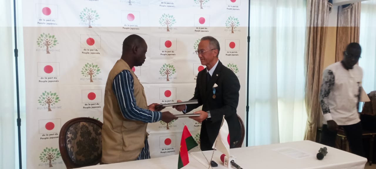L'ambassadeur du Japon et le président de l'association échangent les paraphesEt d'ajouter : « La signature de cet accord de don aujourd'hui n'est pas qu'une formalité administrative, mais un acte de foi en l'avenir. Au Japon, nous disons que le savoir est un trésor qui suit son propriétaire partout, c'est pourquoi nous avons décidé de soutenir ce projet inclusif qui permettra aux élèves, notamment déplacés internes, d'acquérir le savoir. Au Burkina Faso, il est dit que le savoir est une richesse que l'on ne peut pas voler. Ainsi nos deux cultures, bien que géographiquement distantes, partagent la conviction que l'éducation est le socle de tout développement ».