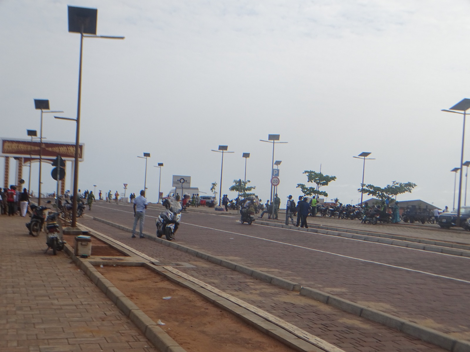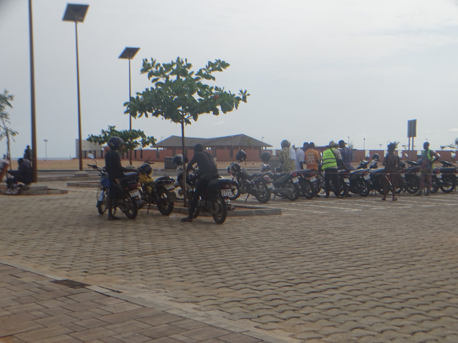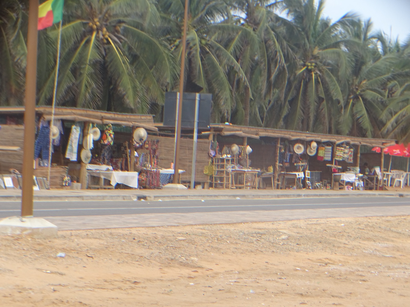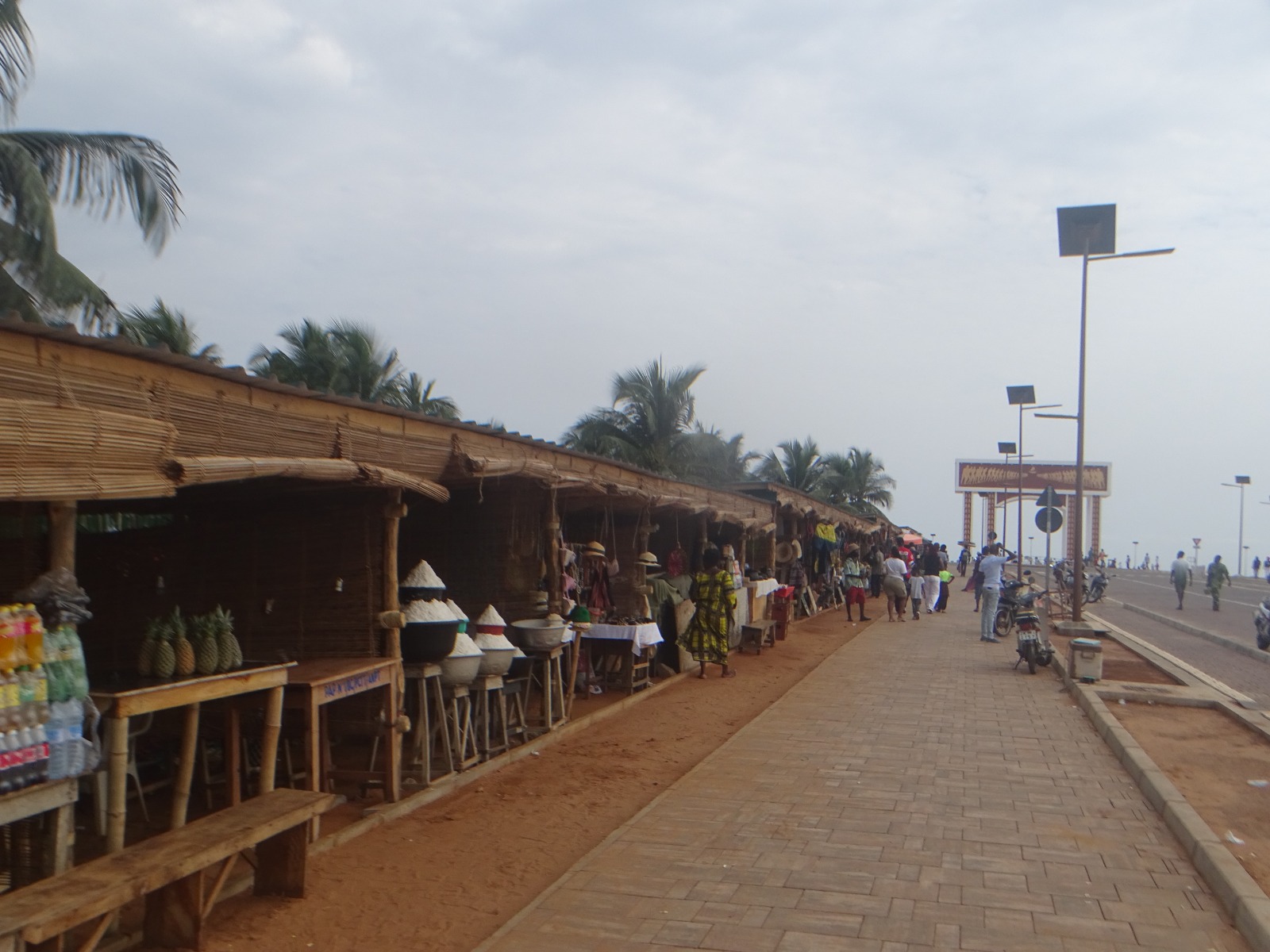 Le parking, à l'entrée de la Plage est bondé de voitures et motocyclettes. À gauche du parking, des commerces alignés proposent objets d'art, tissus, boissons fraîches, du sel de Djègbadji, et autres souvenirs.