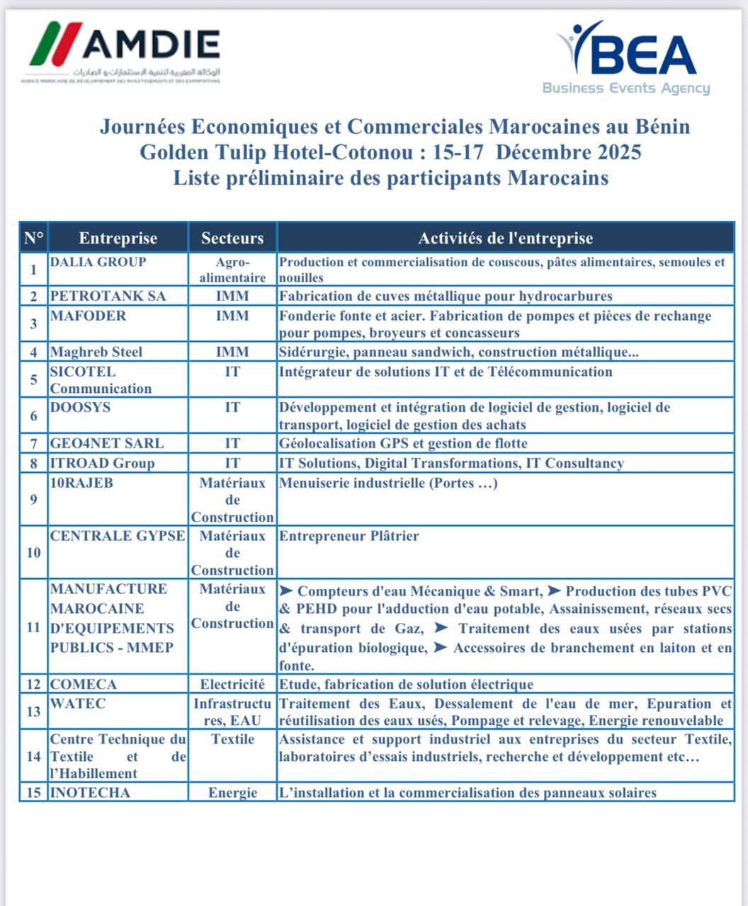 Une délégation marocaine composée d'entreprises issues de plusieurs secteurs : agroalimentaire, électricité, énergie, infrastructures, eau, conseil et ingénierie, IMM, matériaux de construction et technologies de l'information, sera à Cotonou du 15 au 17 décembre 2025.