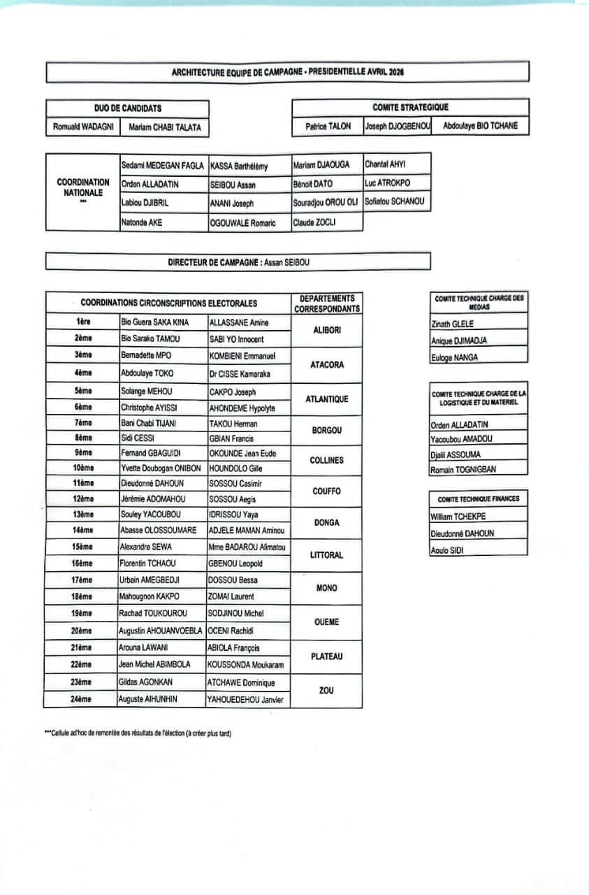 À moins de deux mois de l'élection présidentielle du 12 avril 2026, la mouvance présidentielle béninoise a rendu publique la liste des membres de l'équipe de campagne du duo de candidats formé par Romuald Wadagni et Mariam Chabi Talata.