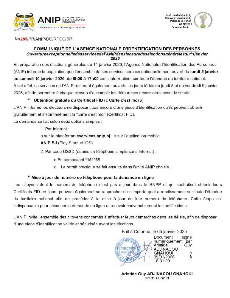 Les services de l'Agence Nationale d'Identification des Personnes (ANIP) seront exceptionnellement ouverts du lundi 5 janvier au samedi 10 janvier 2026, de 8h00 à 17h00 sans interruption, sur toute l'étendue du territoire national. C'est pour permettre à chaque citoyen d'accomplir les démarches nécessaires avant le scrutin le 11 janvier 2026.
