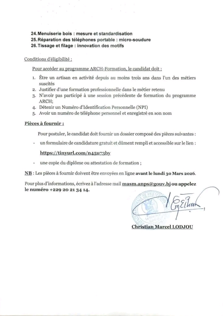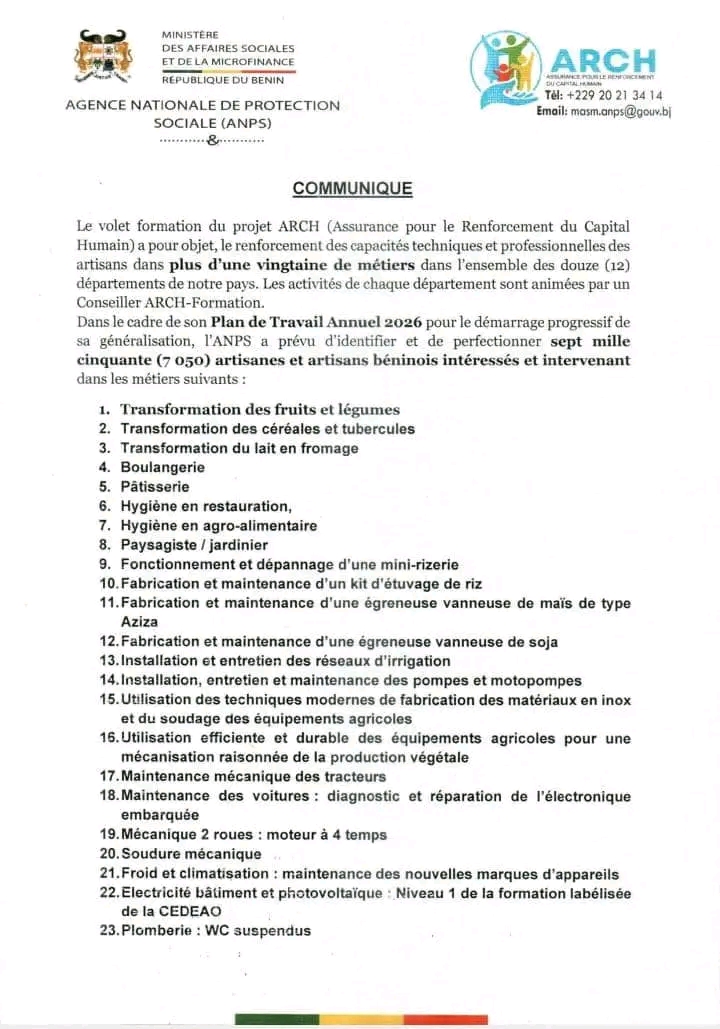 Le gouvernement a lancé, à travers l'Agence Nationale de Protection Sociale (ANPS), le programme de renforcement des capacités visant à identifier et perfectionner 7050 artisanes et artisans dans tous les 12 départements du Bénin. Les inscriptions sont ouvertes jusqu'au 30 mars 2026.