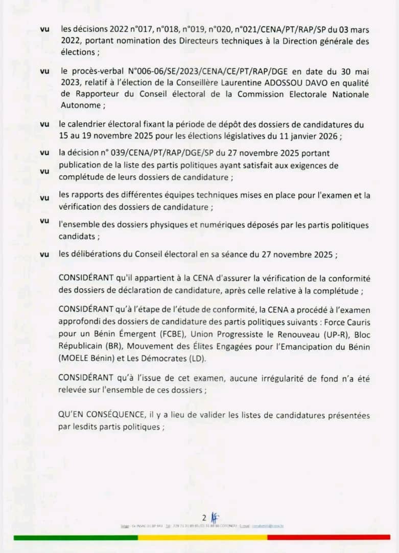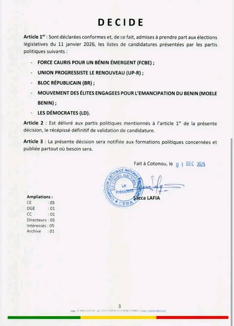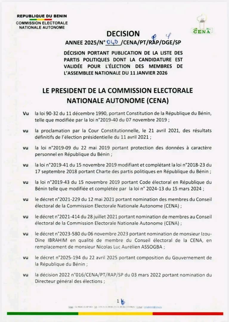 Les listes définitives de candidature des partis aux élections législatives de 2026 ont été publiées ce 1er décembre 2025 par la Commission Electorale Nationale Autonome (CENA).