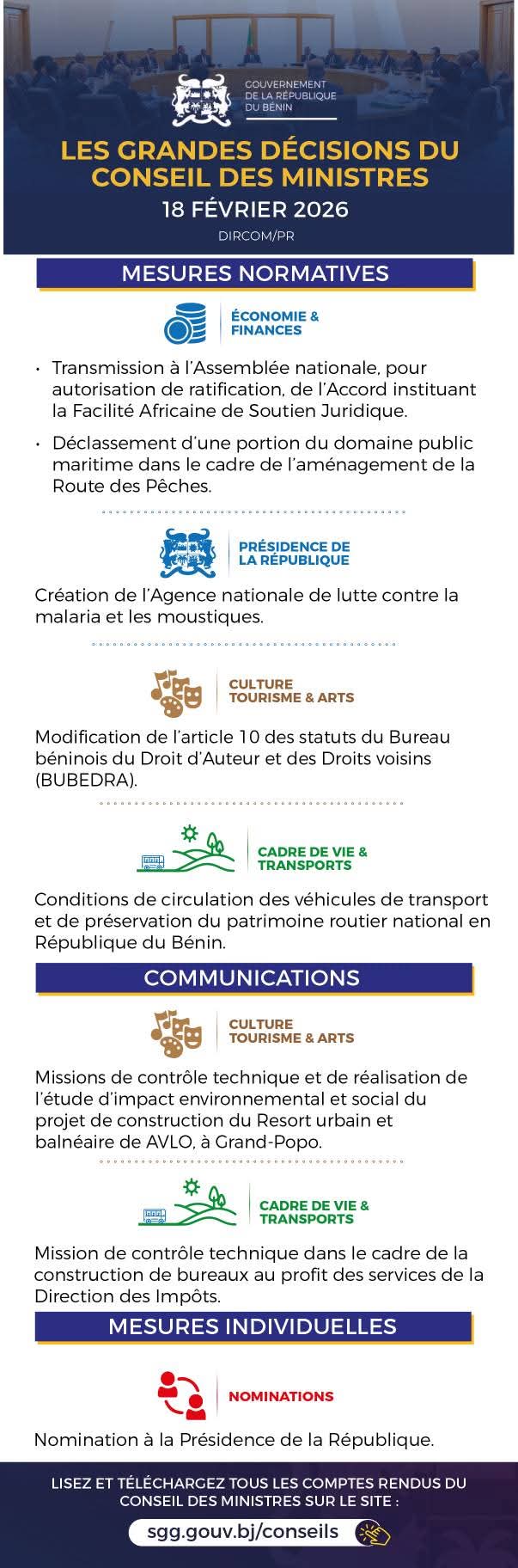 Le Conseil des Ministres s'est réuni mercredi, le 18 février 2026, sous la présidence de Monsieur Patrice TALON, Président de la République, Chef de l'État, Chef du Gouvernement.