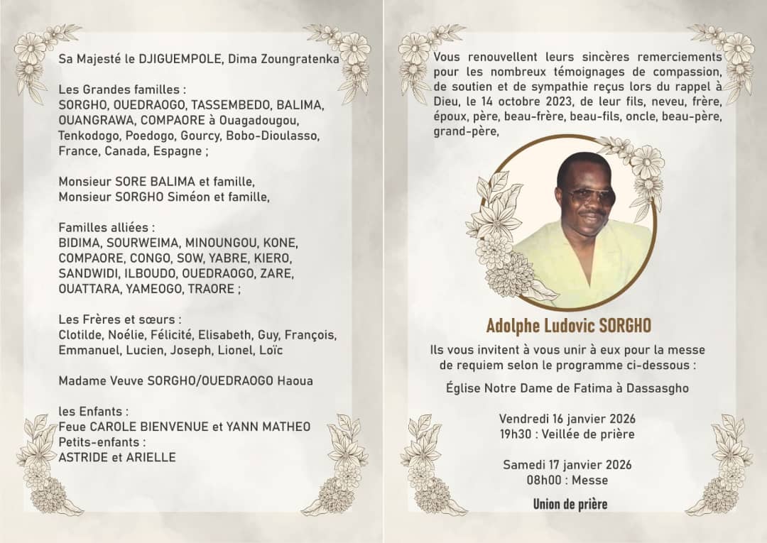 • Le samedi 17 Janvier 2026 : La grande messe de funérailles sera célébrée à 08 heures, suivie de la bénédiction finale.