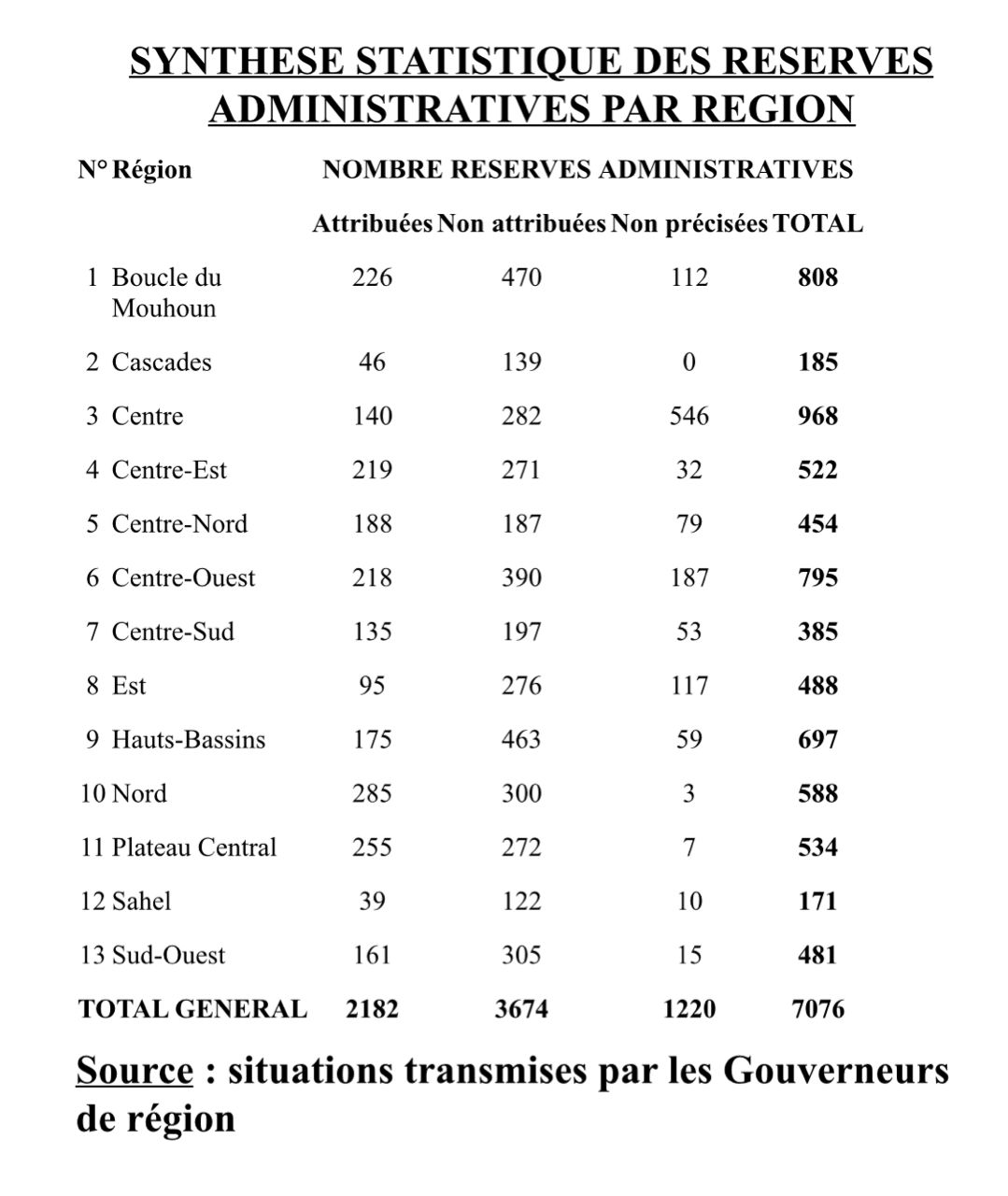 Il en ressort que 7 076 réserves administratives ont été recensées sur l'ensemble du territoire, dont 4 894 sont illégalement occupées, soit 69,16 %.