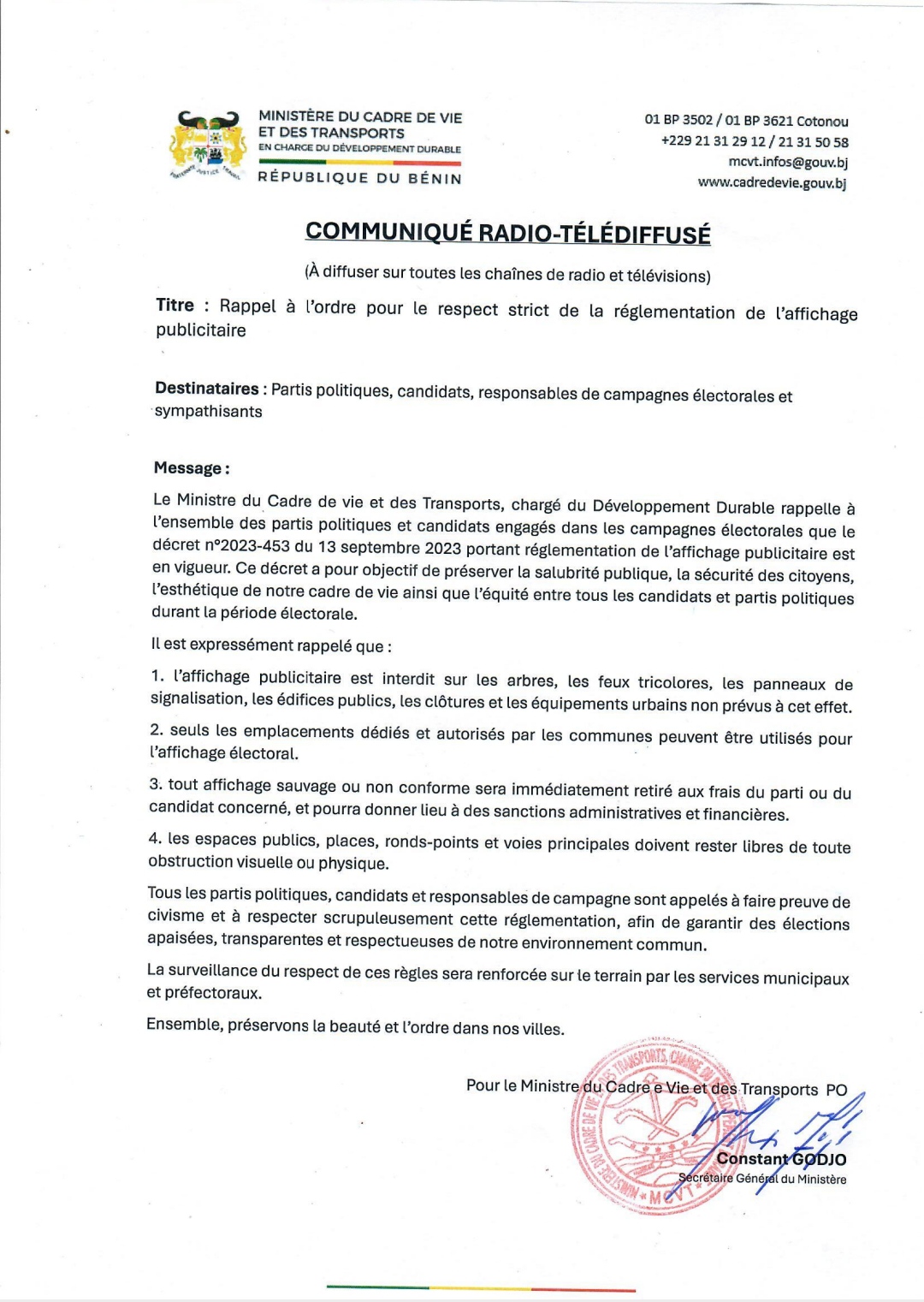Le Ministre du Cadre de vie et des Transports, chargé du Développement Durable rappelle à l'ensemble des partis politiques et candidats engagés dans les campagnes électorales que le décret n°2023-453 du 13 septembre 2023 portant réglementation de l'affichage publicitaire est en vigueur. Dans un communiqué, le ministre du Cadre de Vie et des Transports, rappelle les règles à respecter.