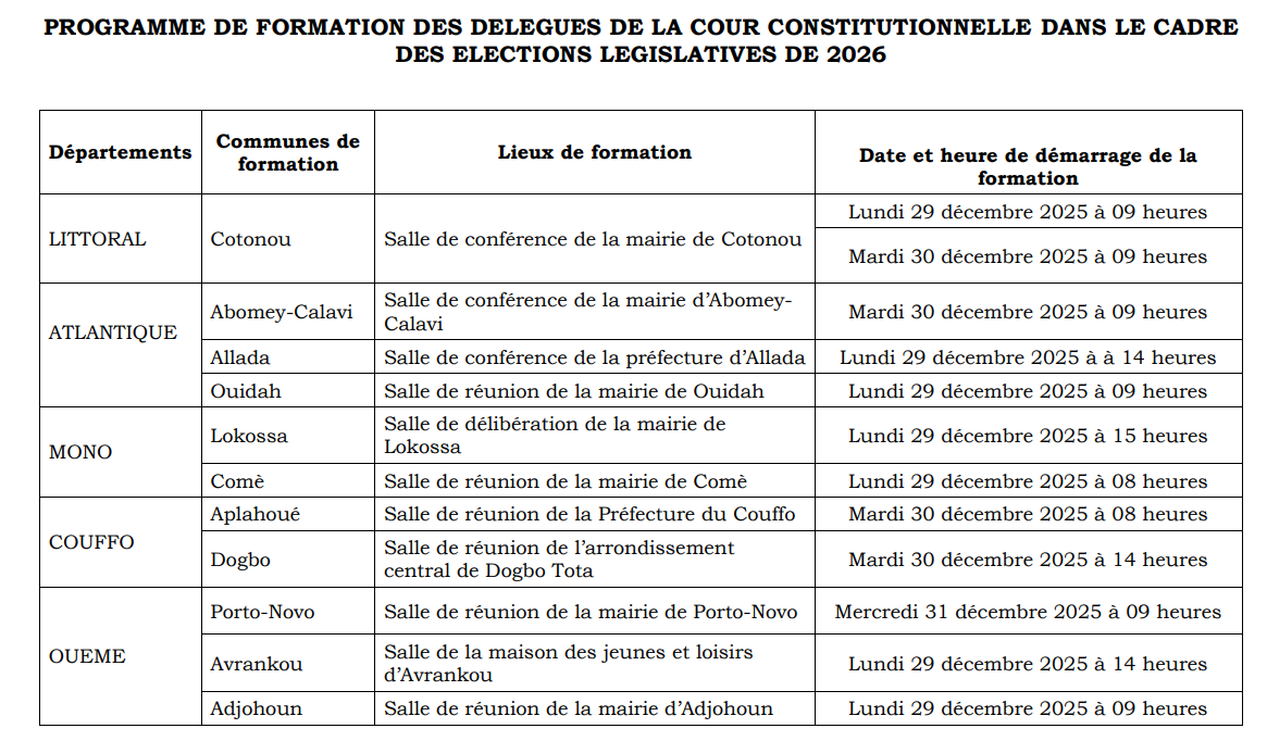 Dans le cadre des élections législatives du 11 janvier 2026, la Cour constitutionnelle forme ses délégués en charge de l'observation de ces élections dans les arrondissements, les communes et au niveau départemental. La session de formation selon une programmation de la Haute juridiction, démarre ce lundi 29 décembre 2025.