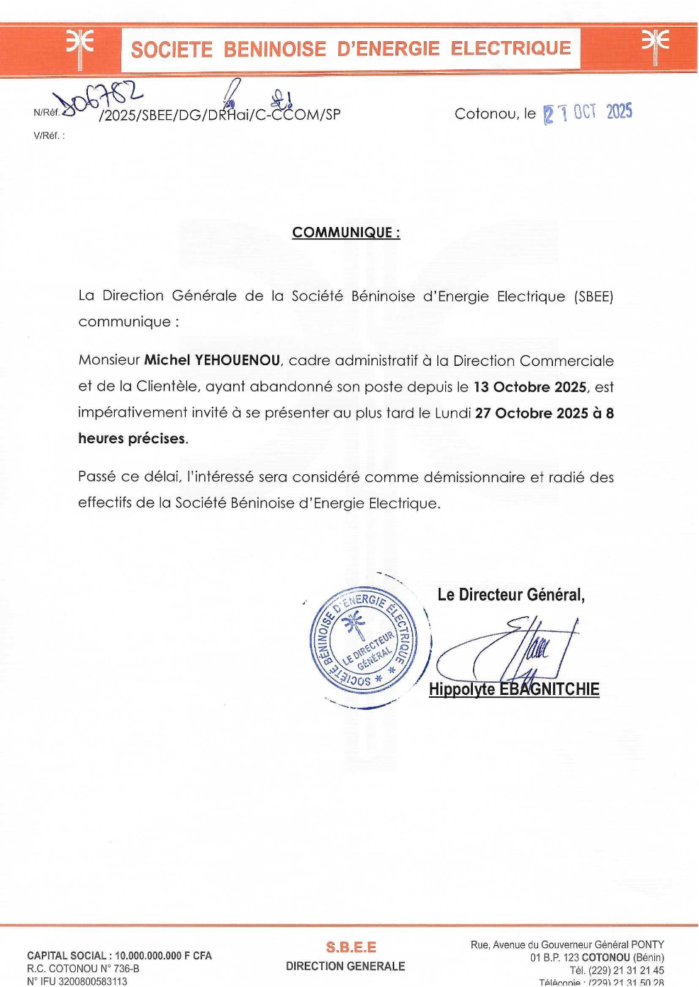La direction générale de la Société Béninoise d'Energie Électrique (SBEE) a sommé, ce mardi 21 octobre 2025, Michel Yéhouenou, cadre administratif à la direction commerciale et de la clientèle, de rejoindre son poste sous peine d'être considéré comme démissionnaire.