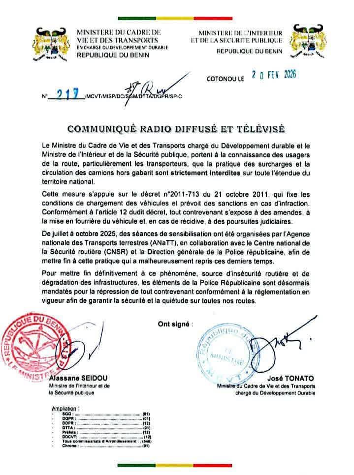 Le ministère de la Décentralisation et de la Gouvernance Locale, Raphaël Akotègnon a ordonné la suspension immédiate de la passation des véhicules de fonction des maires non réélus. C'est à travers un message radio en date du 19 février 2026, adressé aux préfets de département.
