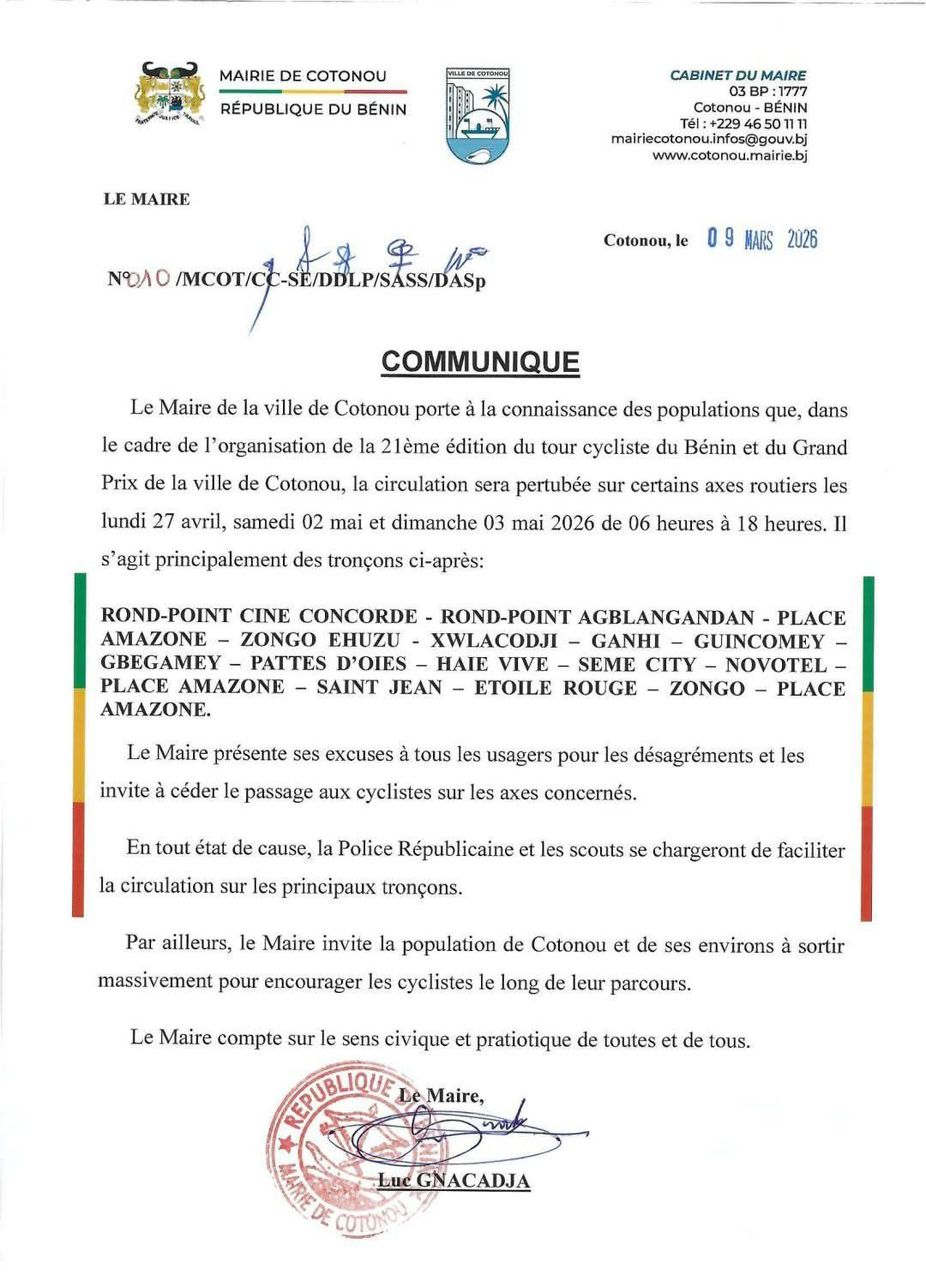 À l'occasion de la 21ème édition du Tour cycliste du Bénin et du Grand Prix de la ville, la circulation sera fortement perturbée à Cotonou les 27 avril, 2 et 3 mai prochains.