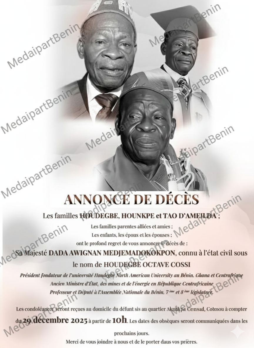 Les condoléances au domicile du défunt au quartier Akpakpa CENSAD débutent le 29 décembre 2025.