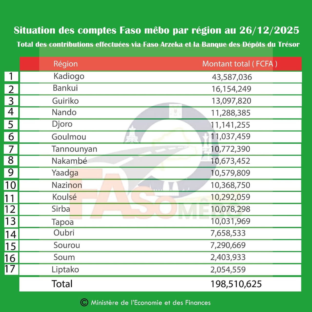 Le point des contributions volontaires à l'initiative présidentielle par région, fait par le ministère de l'Économie, permet de noter qu'à la date du 26 décembre 2025, ce sont au total 198 510 625 FCFA qui ont été récoltés. La région du Kadiogo arrive en tête du classement avec une contribution estimée à 43 587 036 FCFA.