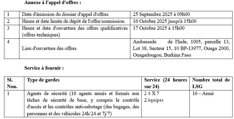 L'Ambassade de l'Inde à Ouagadougou sollicite des devis sous pli fermé auprès d'agences de sécurité privées agréées et réputées pour la mise à disposition d'agents de sécurité armés et non armés dans les locaux de la Chancellerie de l'Ambassade de l'Inde à Ouagadougou, au Burkina Faso. Le déploiement débutera après la signature d'un accord avec l'Ambassade. La durée initiale du contrat sera de deux ans et pourra être réduite ou prolongée à la discrétion de l'Ambassade.