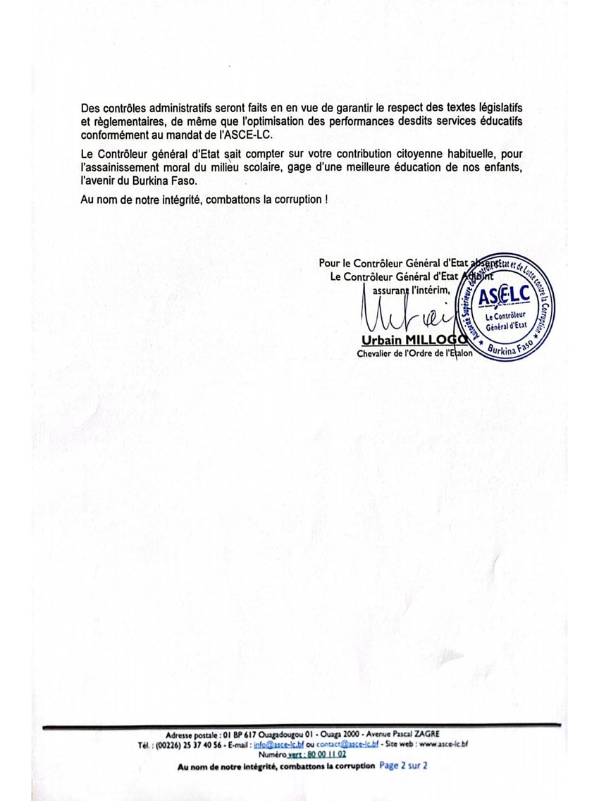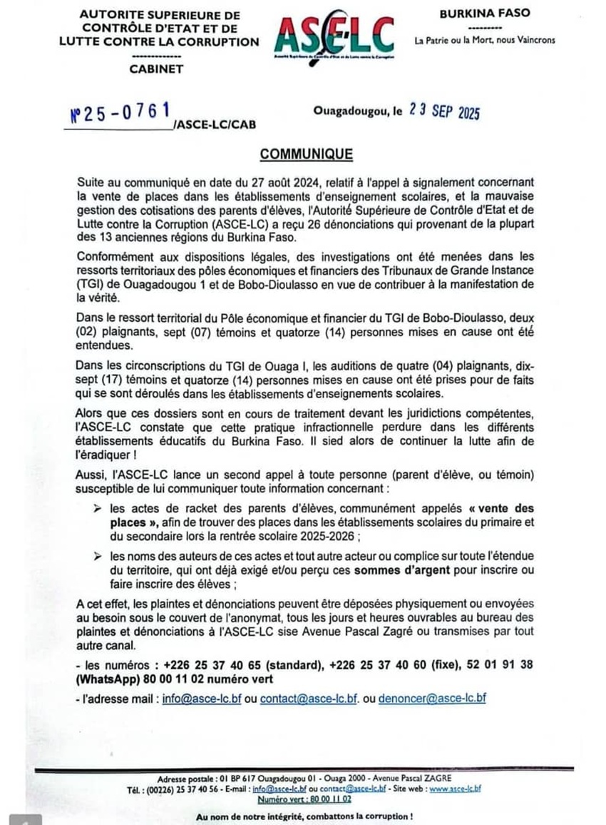 Après avoir enregistré 26 dénonciations en 2024 sur la vente illégale de places et la mauvaise gestion des cotisations des parents d'élèves, l'Autorité supérieure de contrôle d'État et de lutte contre la corruption (ASCE-LC) constate la persistance de ces pratiques dans les établissements scolaires. Elle lance un nouvel appel aux parents et témoins pour signaler tout cas de racket lié à l'inscription des élèves pour la rentrée 2025-2026. Cela afin de contribuer à l'assainissement du milieu éducatif au Burkina Faso.